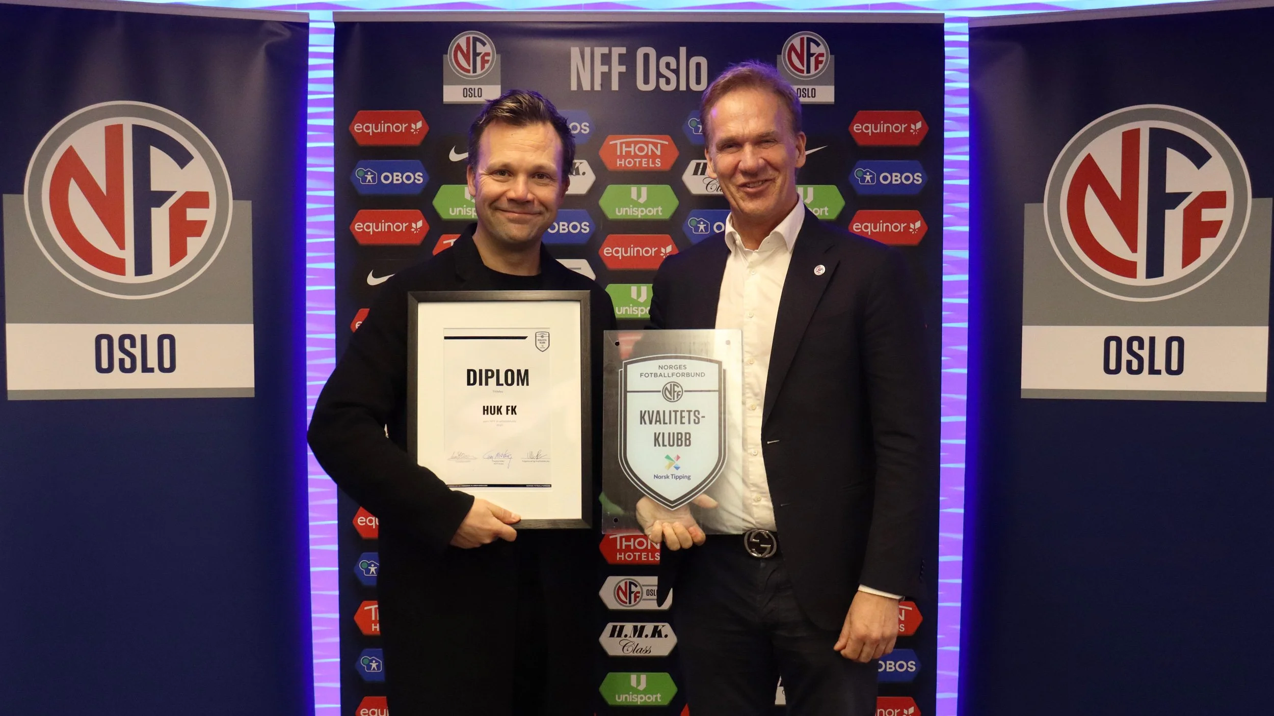 HUK Fotball ble hedret som Kvalitetsklubb. Sportslig leder Anders Gottlieb-Nygaard tok imot diplom fra styremedlem i Norges Fotballforbund, Jon Mørland. (FOTO: NFF Oslo)